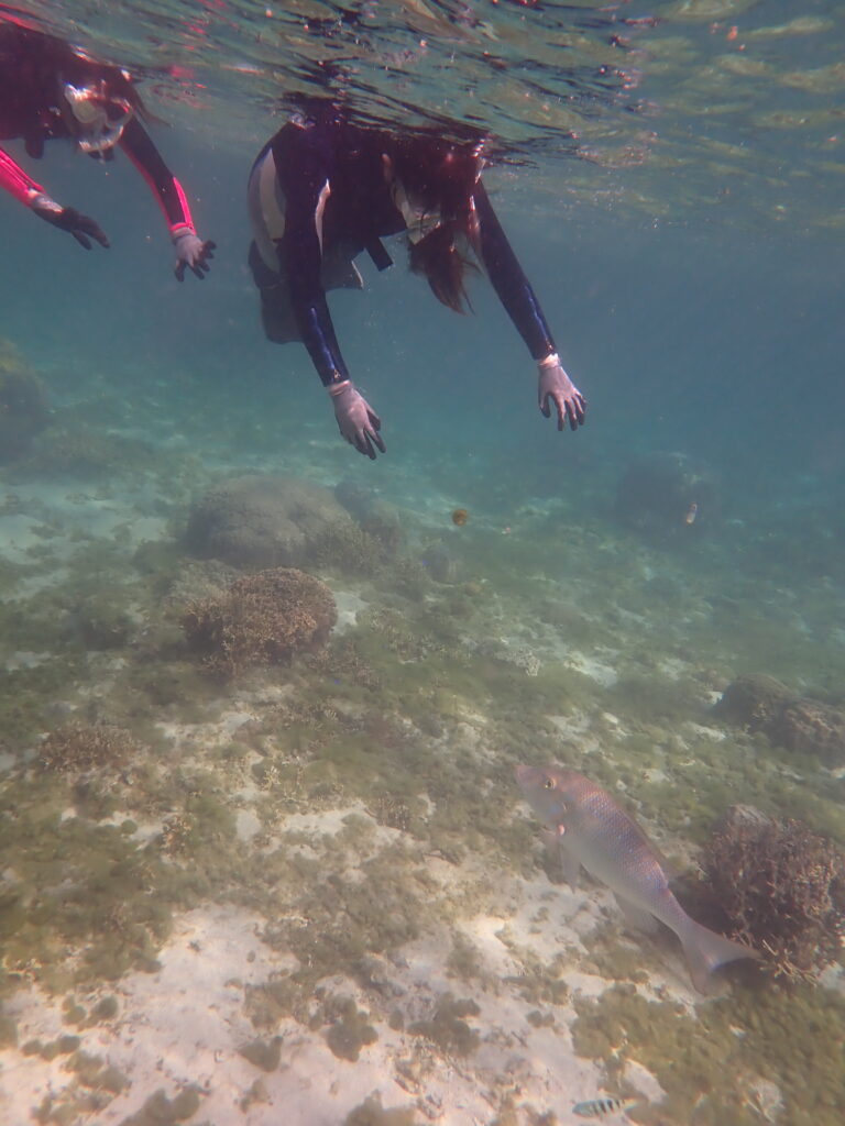 今日は30代の女性2人組をご案内。お目当てのウミガメやクマノミに出会えたのはもちろん、今日は大きなタマン(ハマフエフキ)がずっと私たちの後をついてきてくれるという嬉しいハプニングも!ゲストのお二人も「まるでワンちゃんみたい!」と、その人懐っこさに大感動。デバスズメダイの群れに囲まれながら、癒やしのひとときを過ごしました。