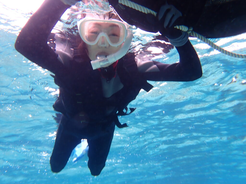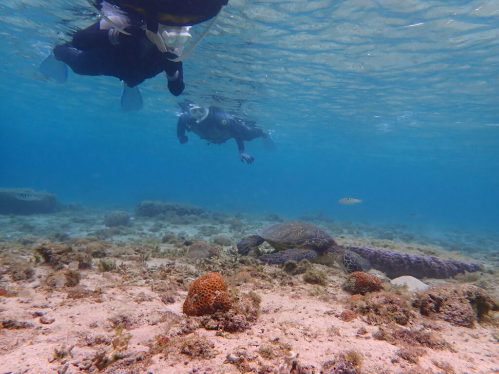 経験豊富なプロガイドとして、安全を守りながら一番美しいポイントへエスコート。 2匹のウミガメさんが優雅に泳ぐ姿や、手の届きそうな距離まで寄ってくるスズメダイたちの生命力を間近に感じていただきました。